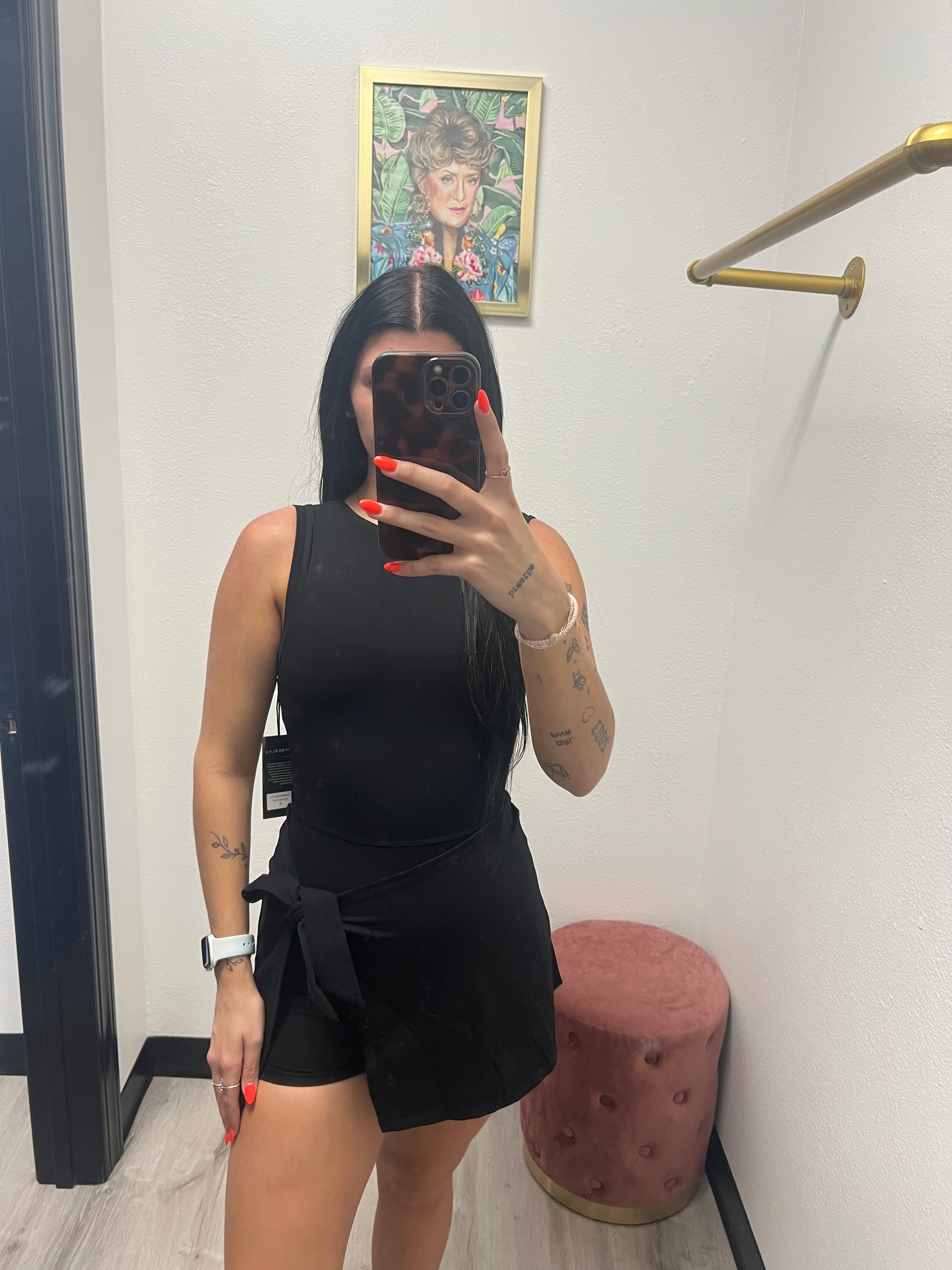 This trending wrap dress with a romper underneath is NEEDED! Model is in a size medium.